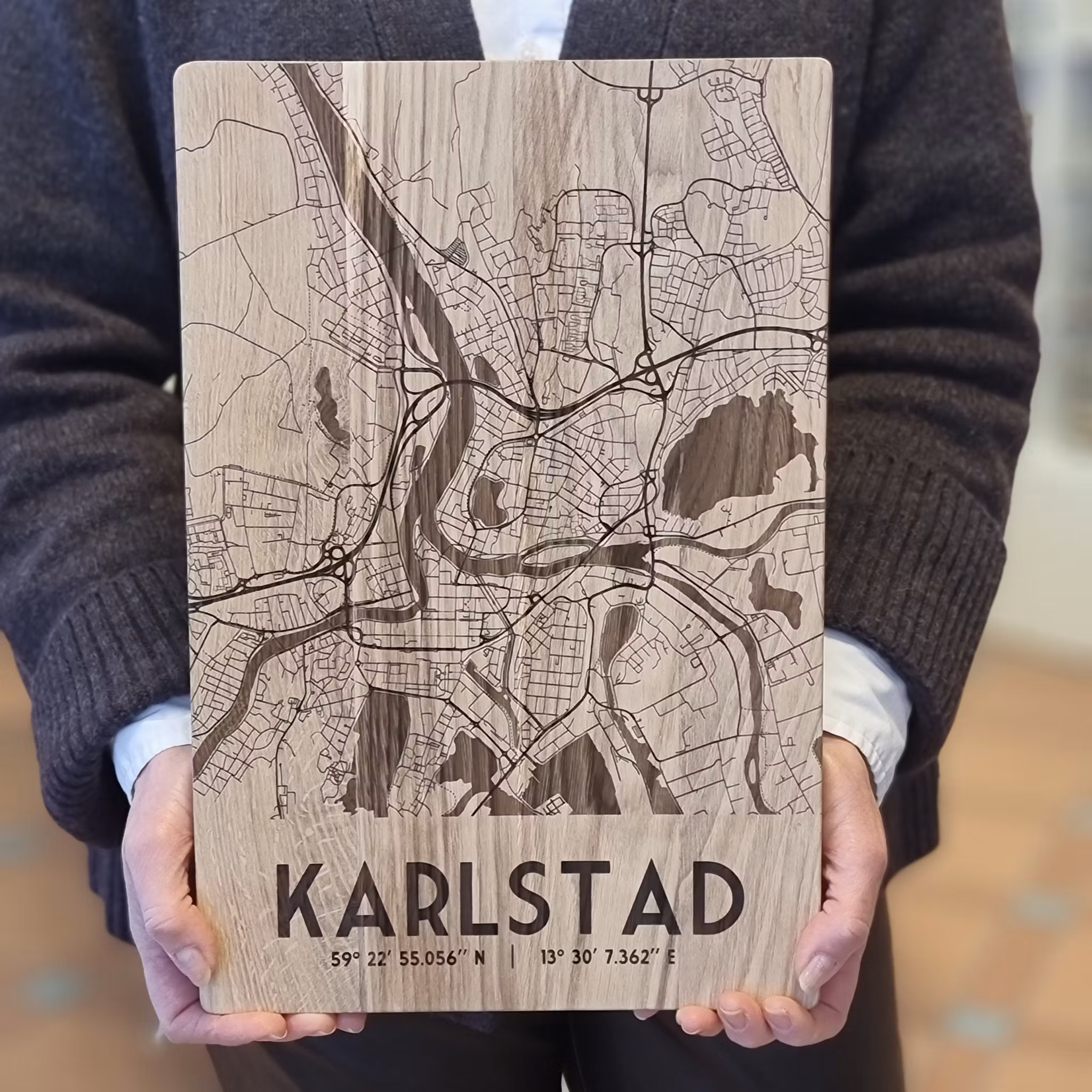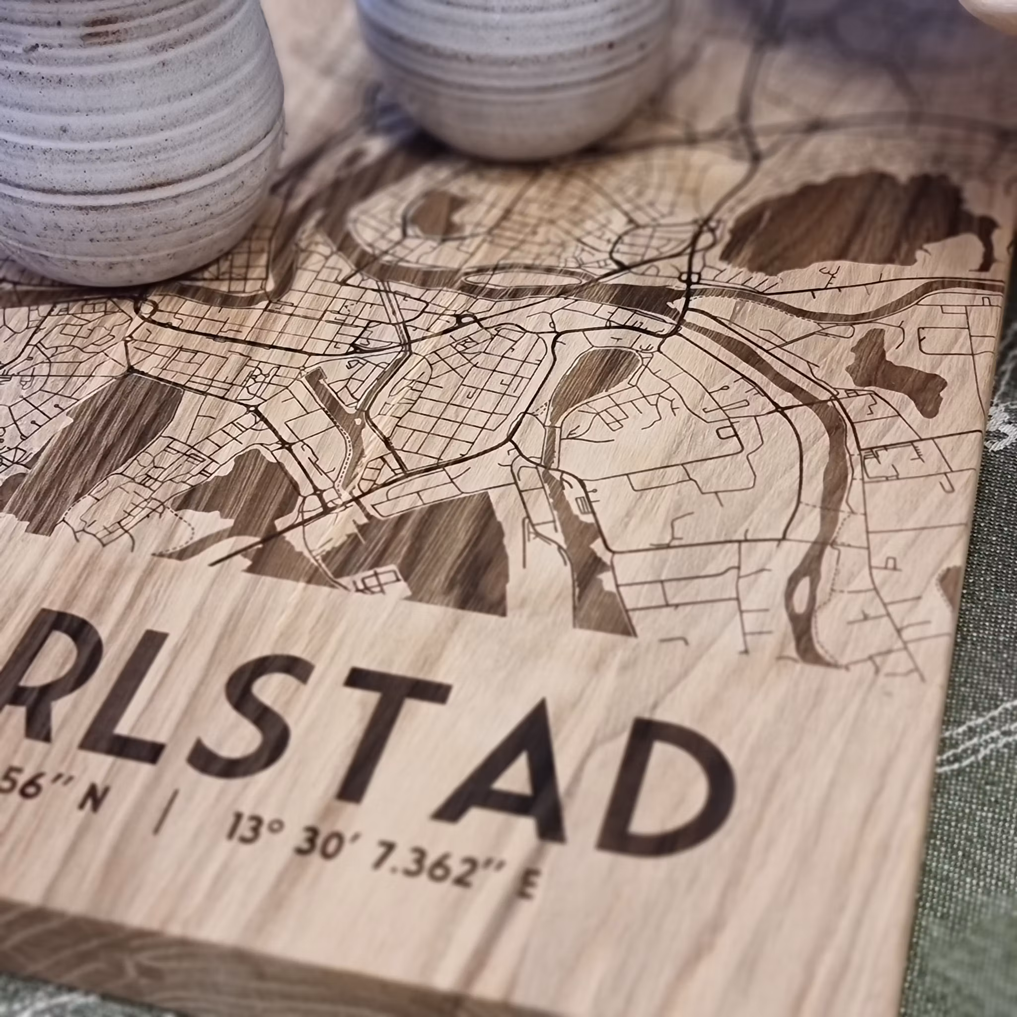 En stilren skärbräda i trä med ingraverad karta över Karlstad – både praktisk och dekorativ. Perfekt som gåva till hemvändaren, Karlstadbon i förskingringen eller bara den som bär staden i hjärtat. Passar lika bra som skärbräda, serveringsbricka eller köksdekoration. PS. om du skär på baksidan förstörs inte den fina ytan.