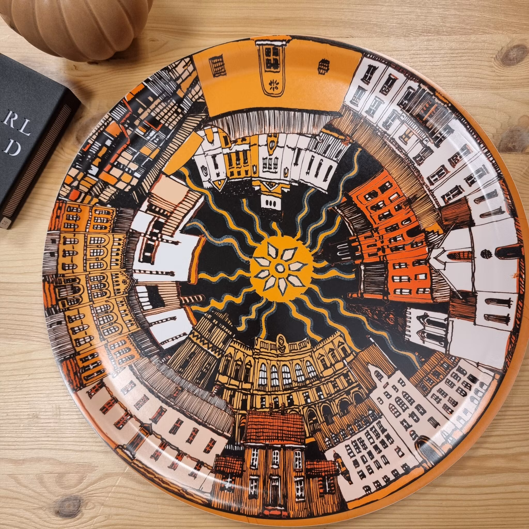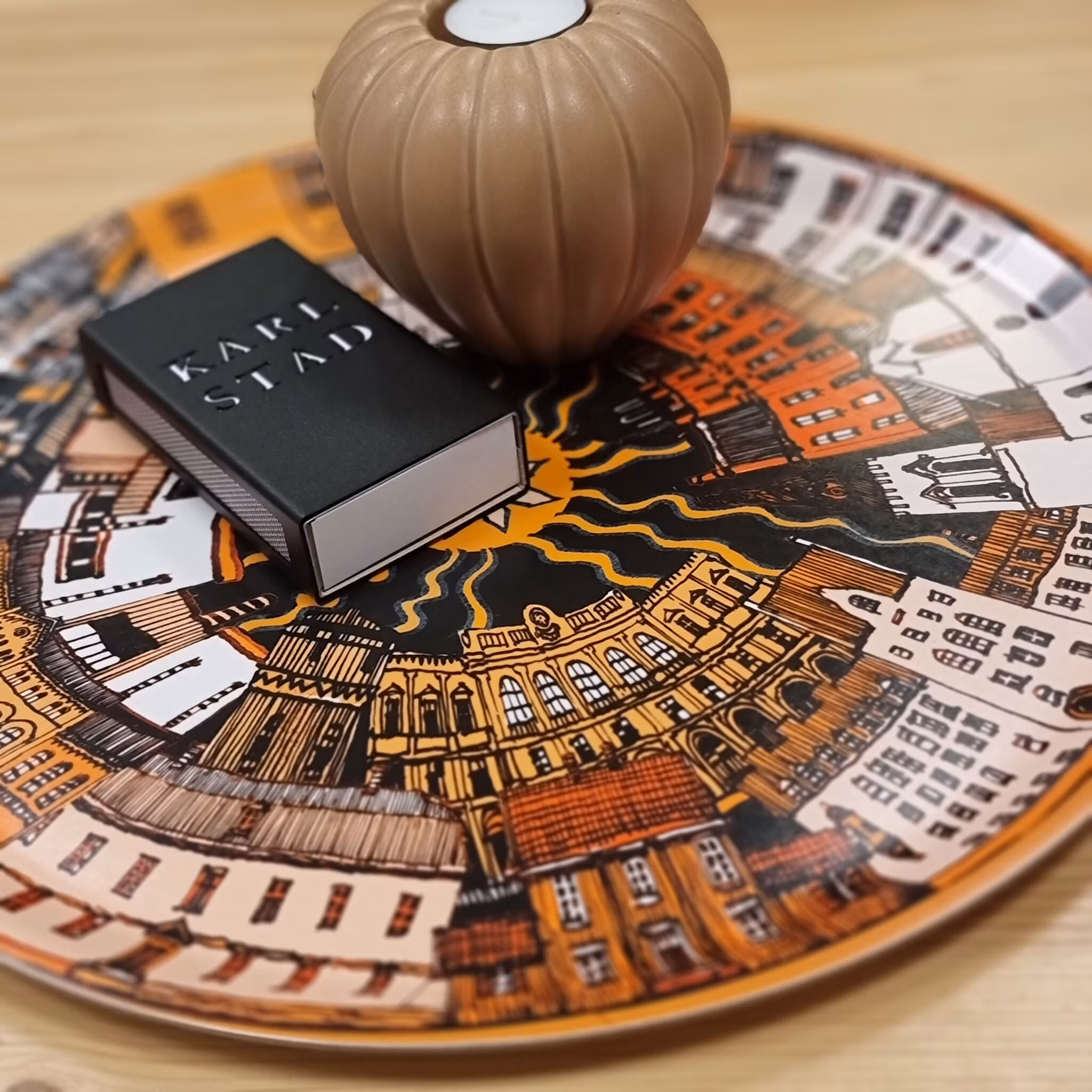 Rund bricka med design av Gunnar Lidén. Här hittar du Karlstads alla landmärken formade runt vår karaktäristiska sol! På baksidan finns alla byggnaderna listade.