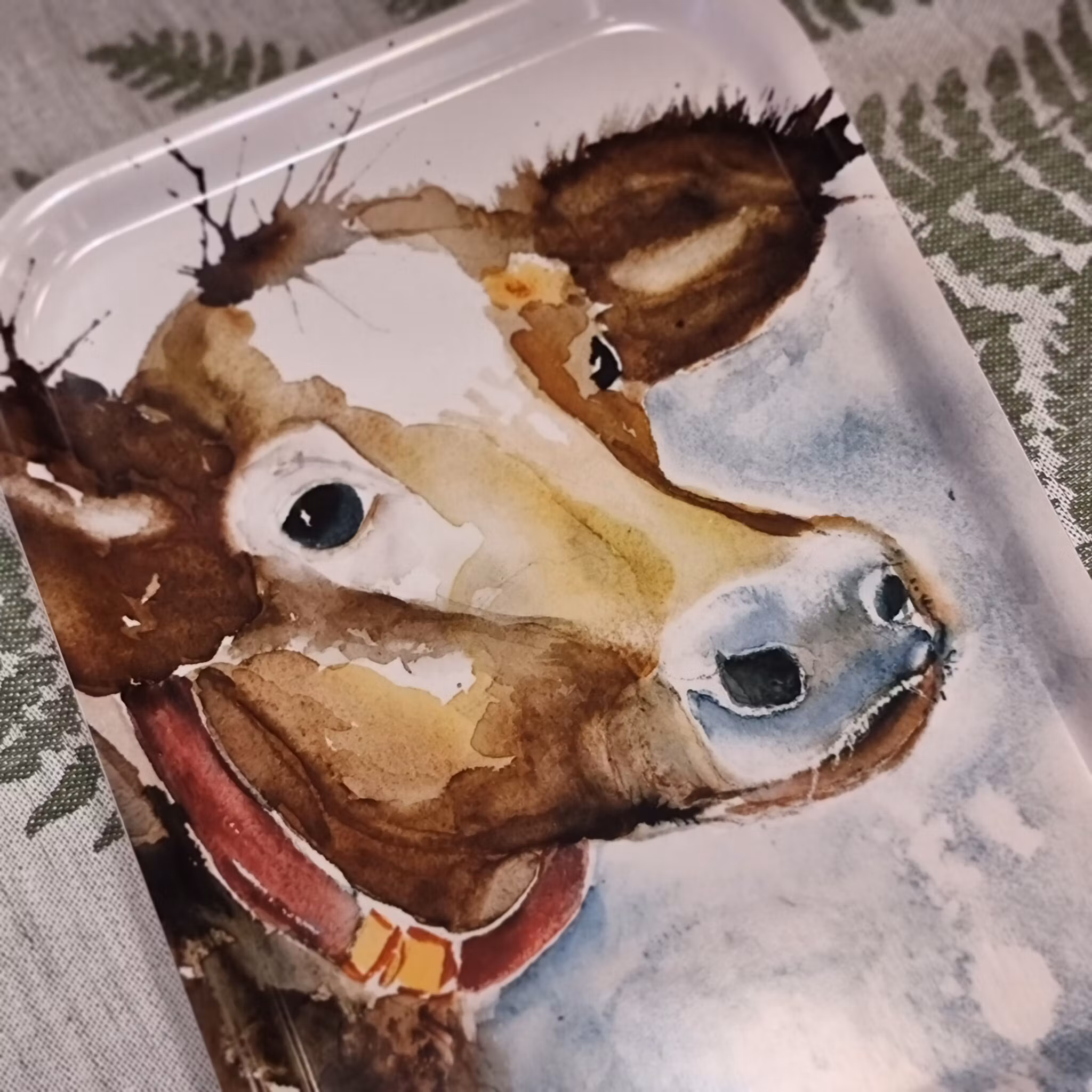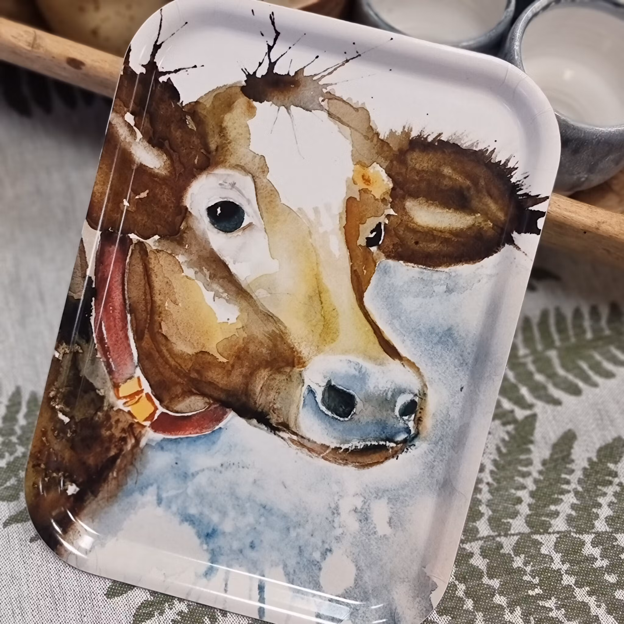 En ko med mjuk blick och lugnt uttryck – precis som kor brukar se ut. Den snälla blicken säger ungefär: "Jag dömer dig inte, jag bara står här och idisslar." Ett motiv som bjuder på både ro och ett leende.