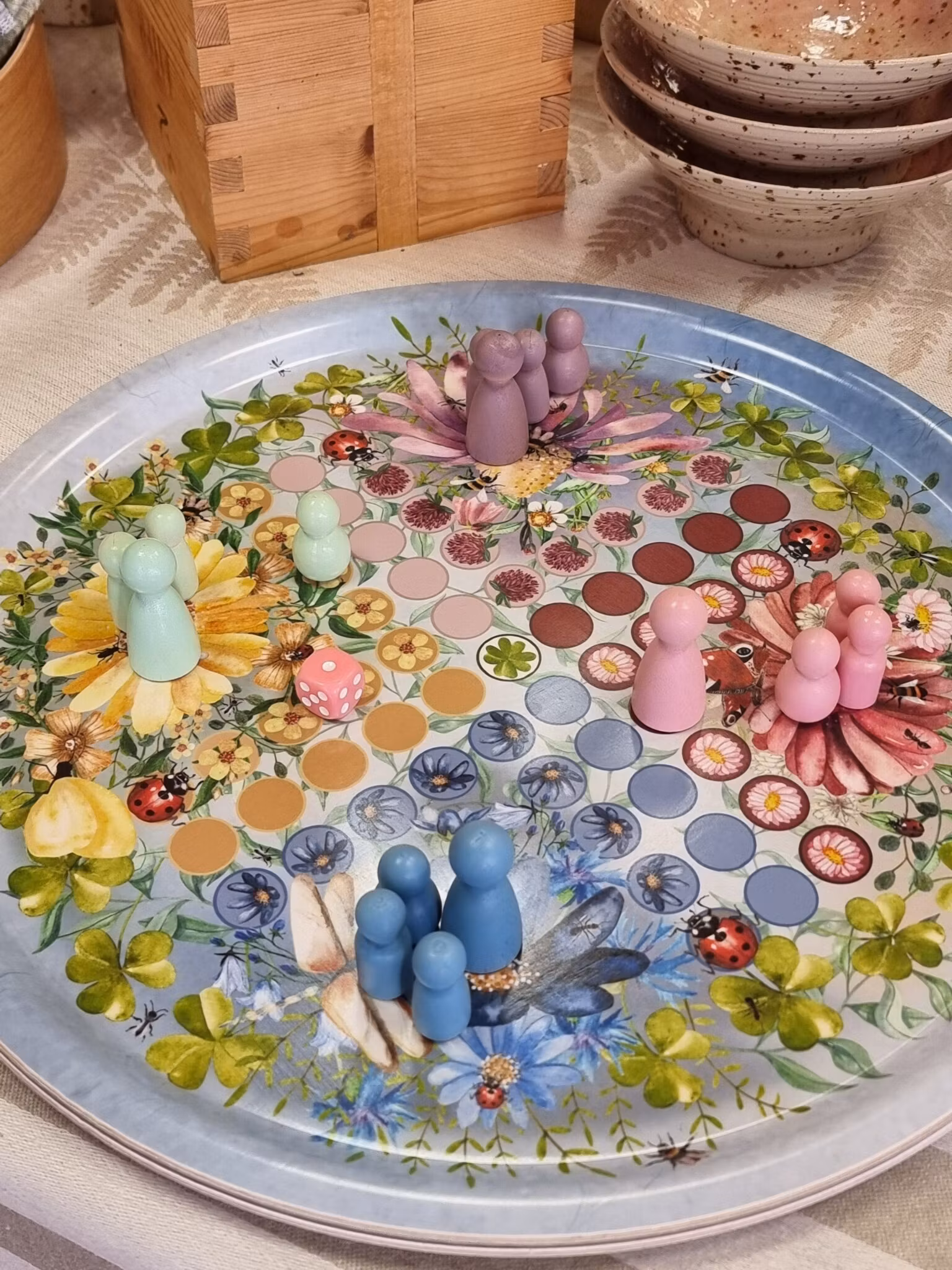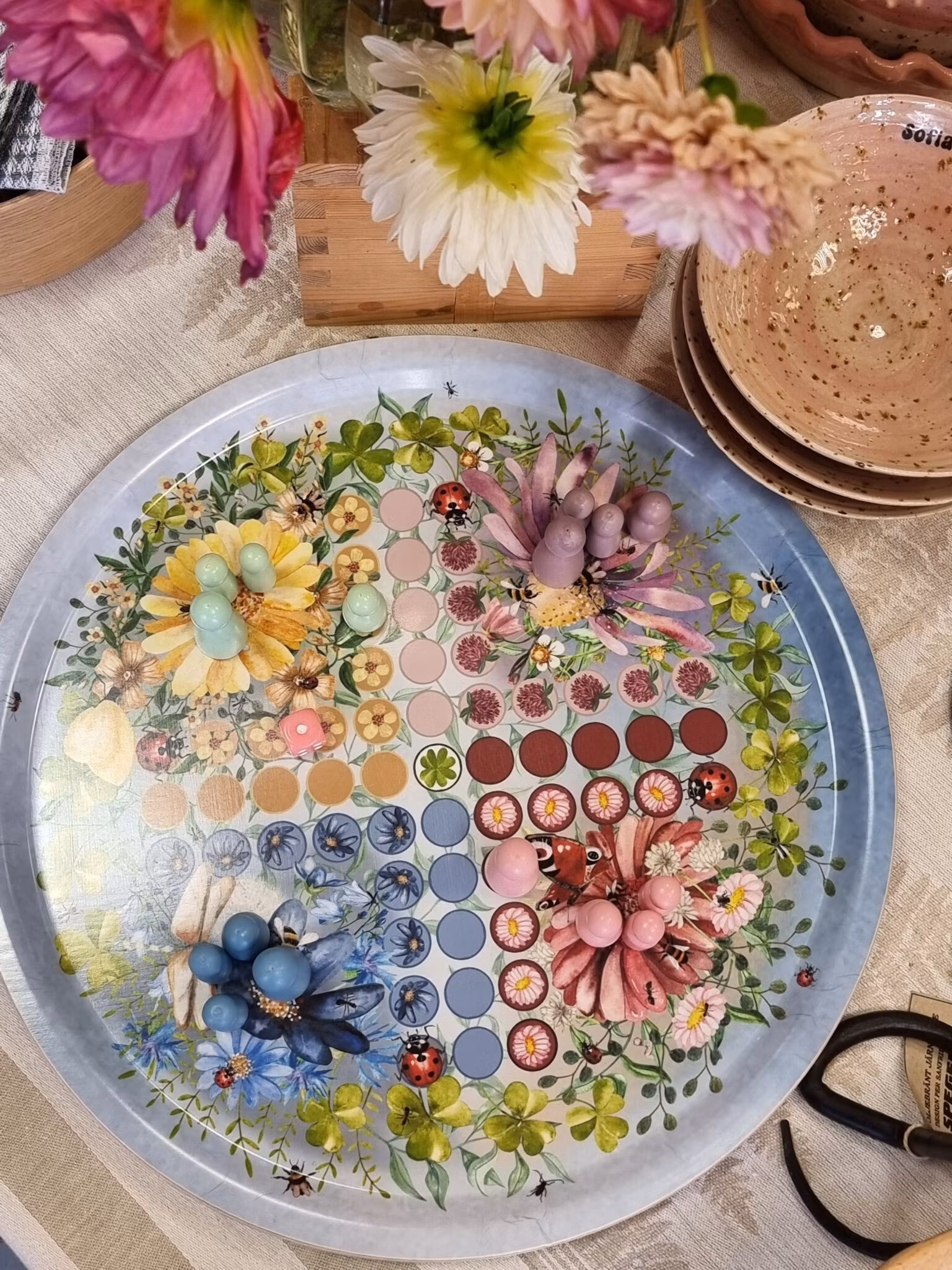Denna vackra bricka är mer än bara snygg med sitt blommiga mönster – den bjuder in till skratt och samspel! Under ytan gömmer sig ett komplett Fia med knuff-spel, med pjäser och tärning redo för action. Perfekt för fikastunden, spelkvällen eller som en oväntad gåva. Praktisk, dekorativ och alltid redo för en omgång – året runt!