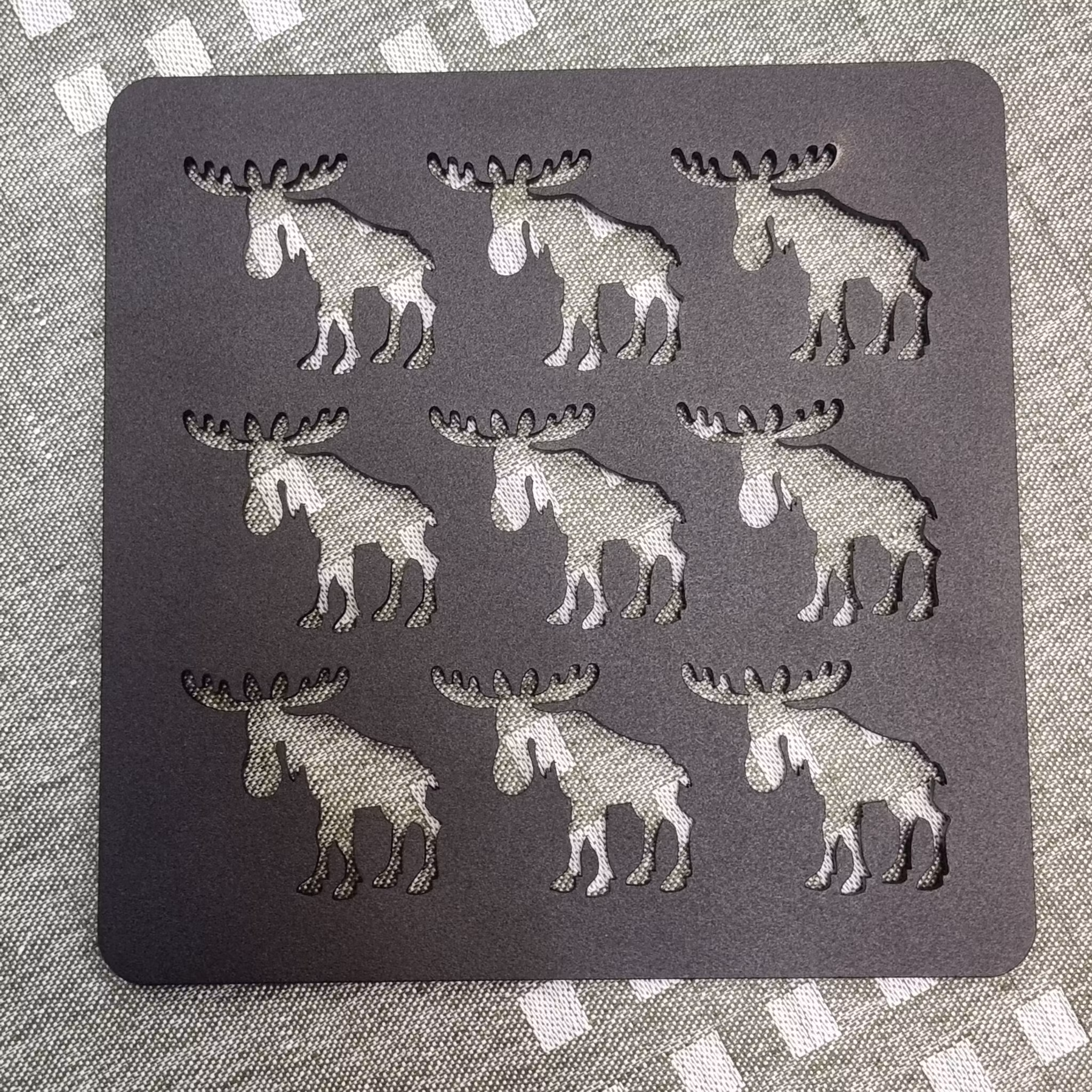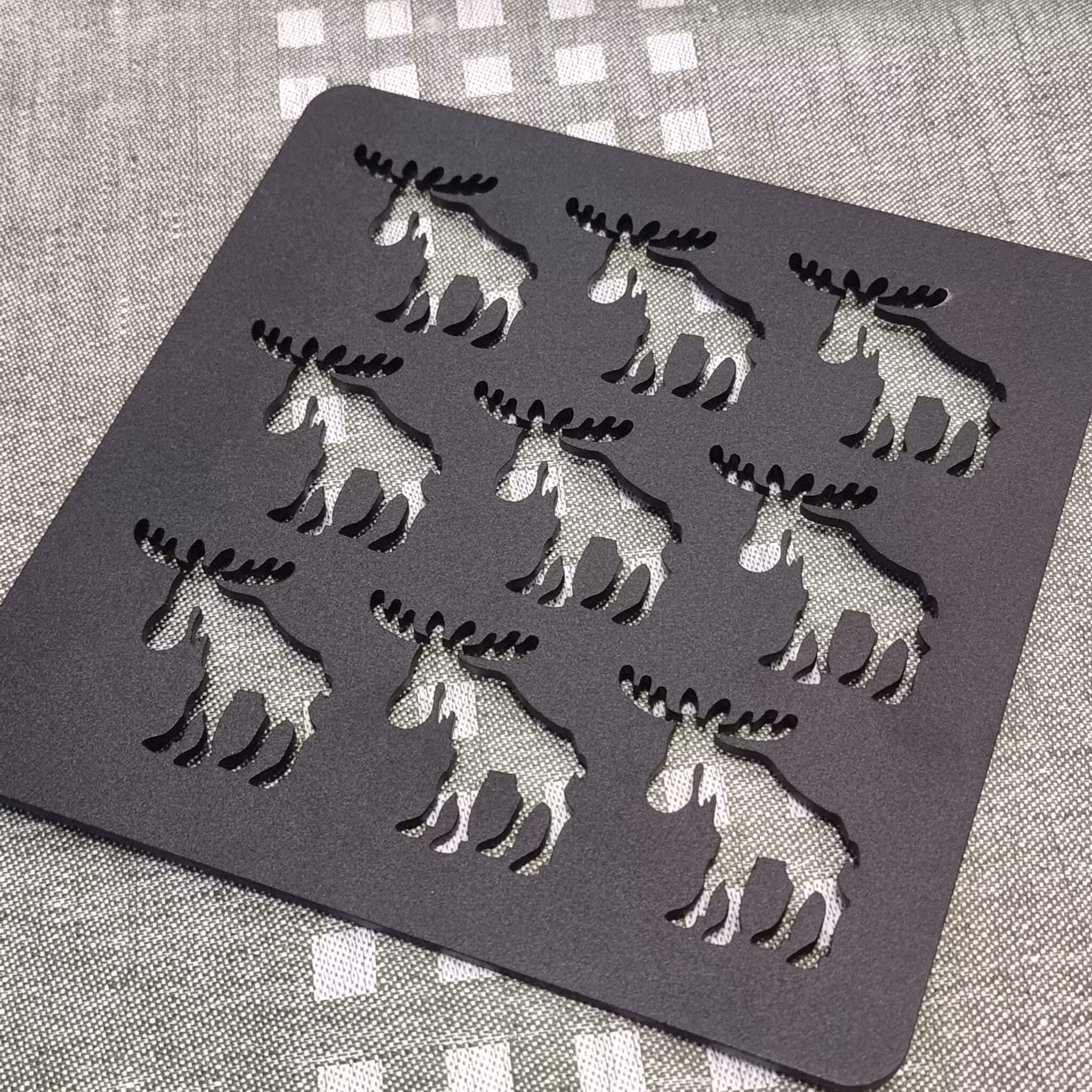 Stadigt och stabilt grytunderlägg i pulverlackat järn, med utstansade älgar. Ett praktiskt kökstillbehör som också är ett konstverk i sig!