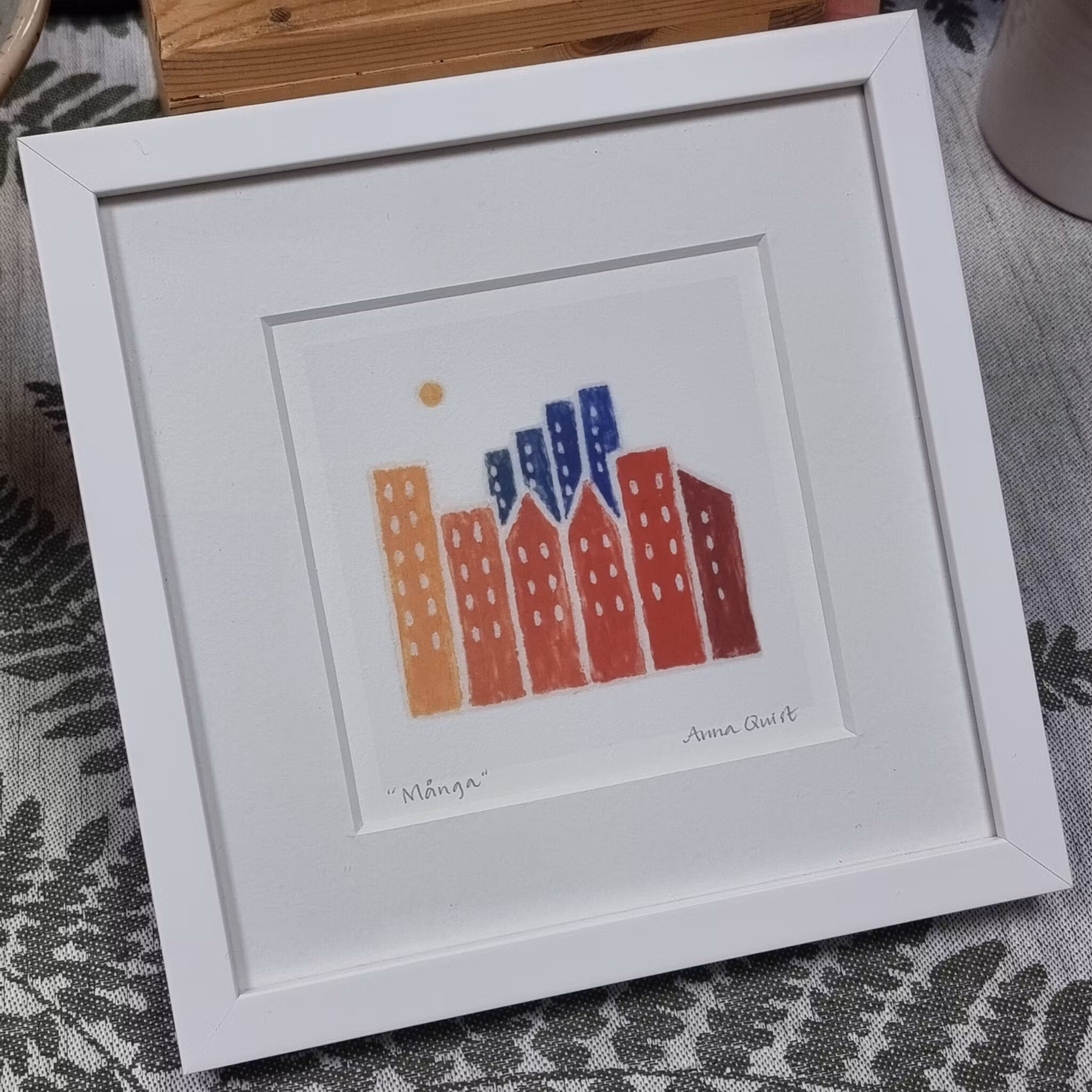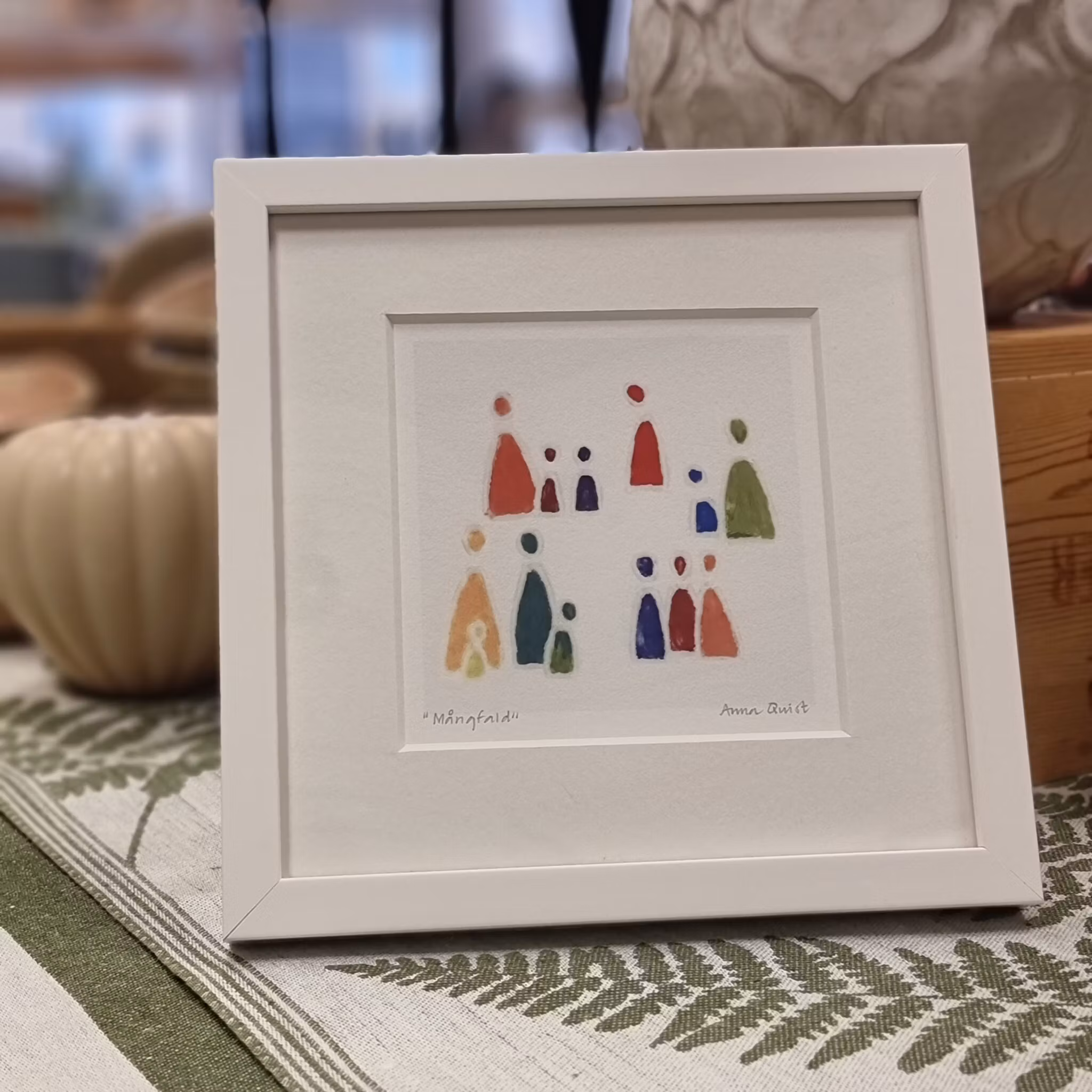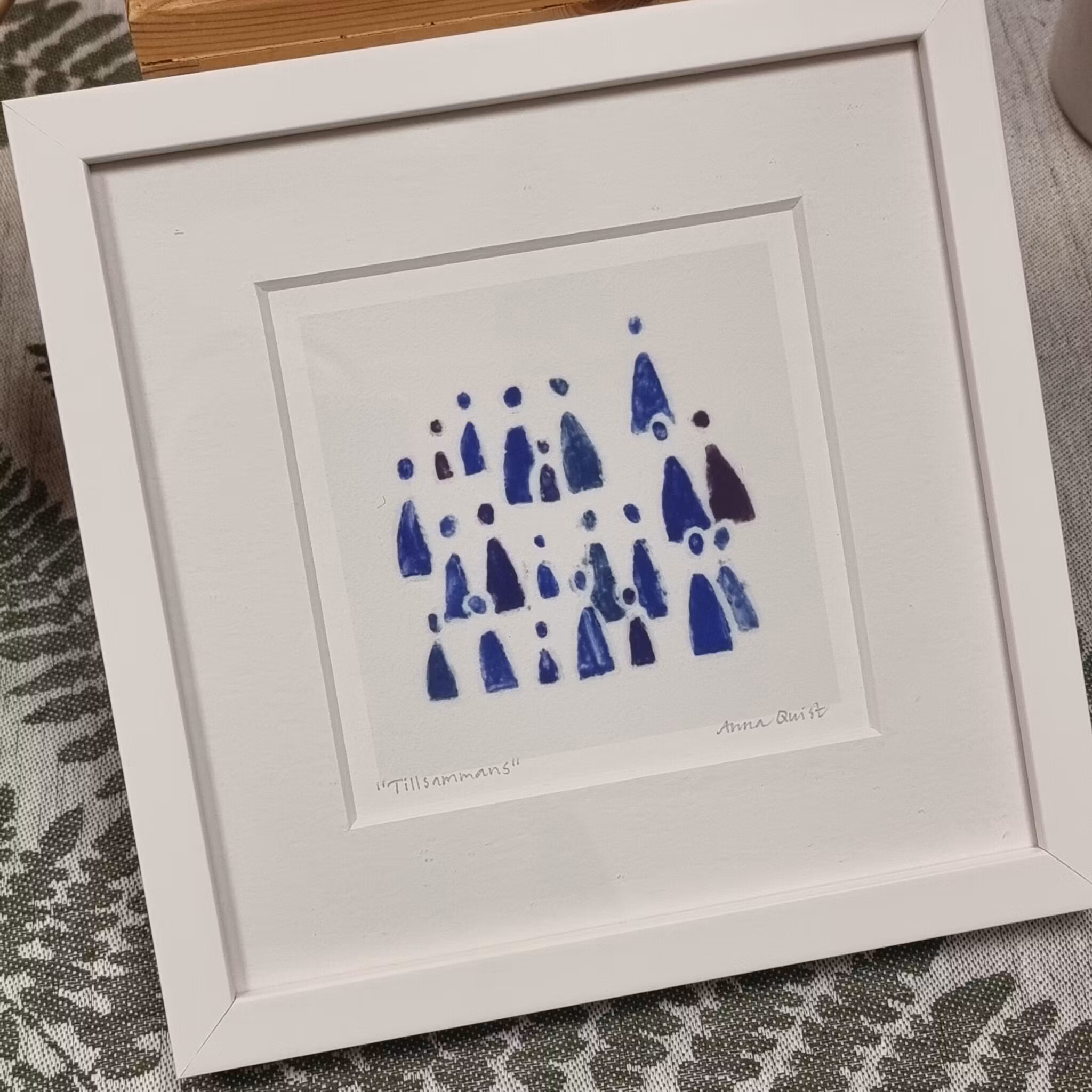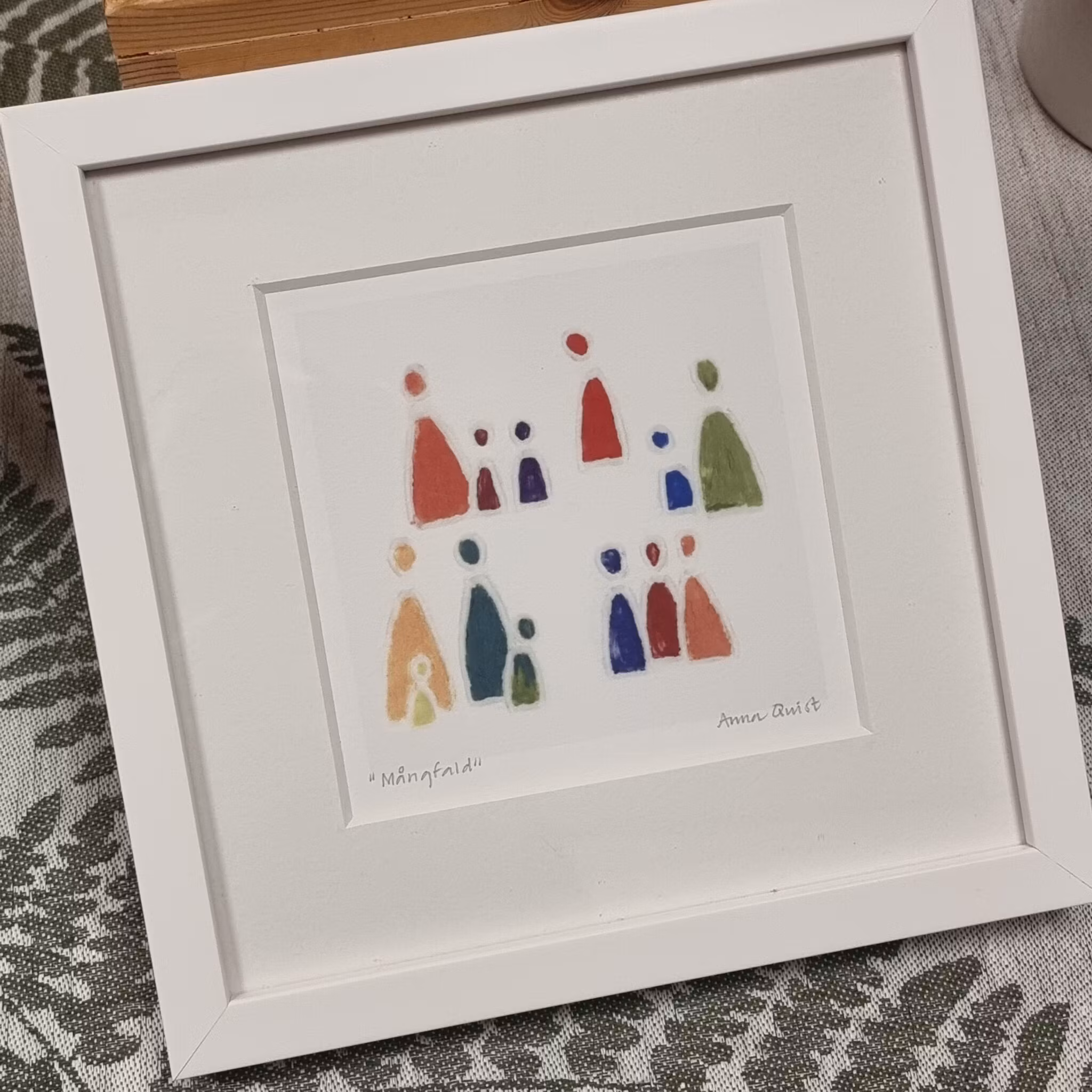Anna Quist skapar främst bilder och skulpturer i keramik, men här har hon återskapat några av hennes populära motiv som ett konsttryck. Levereras i en svensktillverkad vitlackad träram. Välj mellan motiven "Tillsammans", "Många" och "Mångfald"