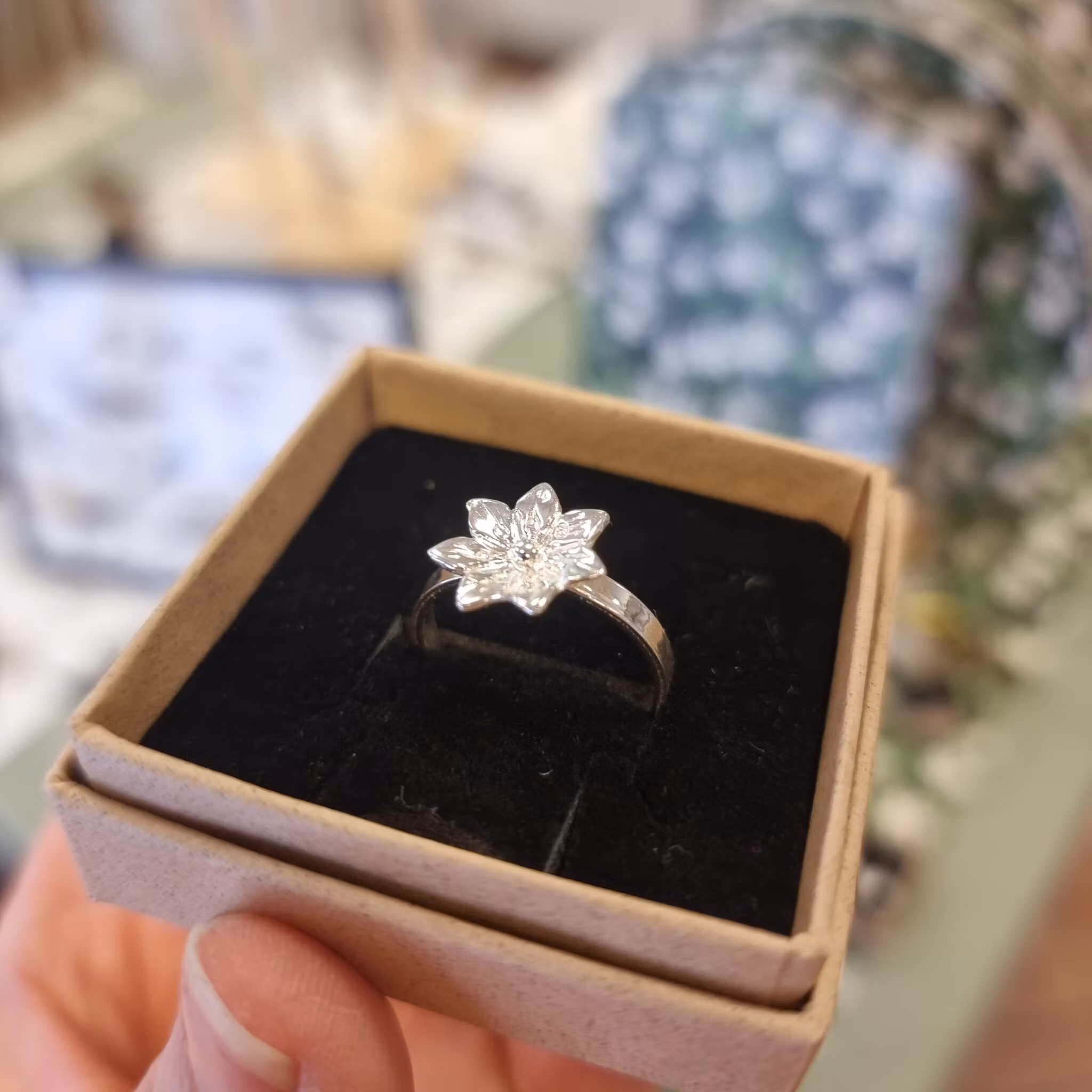 Skogsstjärna-smycket är en hyllning till den vackra landskapsblomman som blommar på försommaren. Perfekt för dig som älskar naturen, Värmland eller bara vill ha ett unikt smycke som väcker uppmärksamhet. Ringen är ställbar och tillverkad i 925 silver, både tidlöst och hållbart.