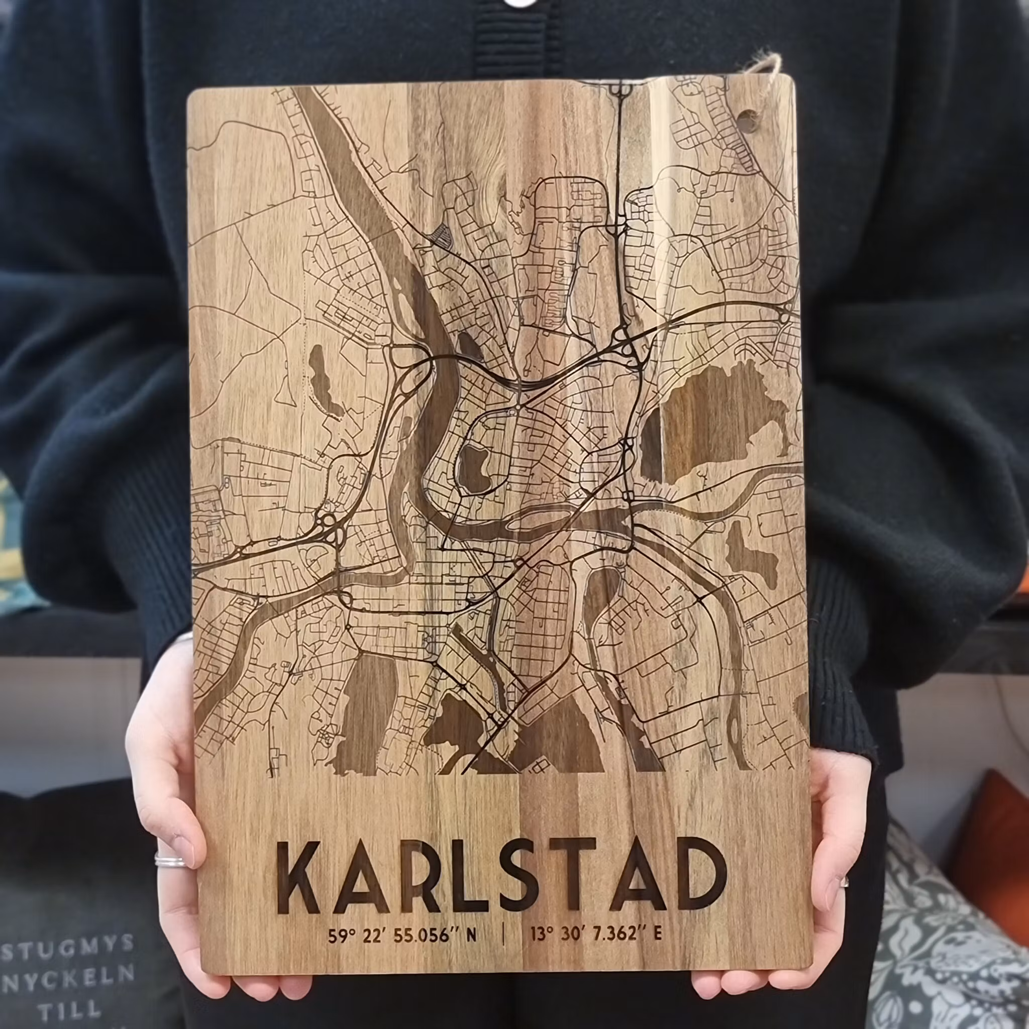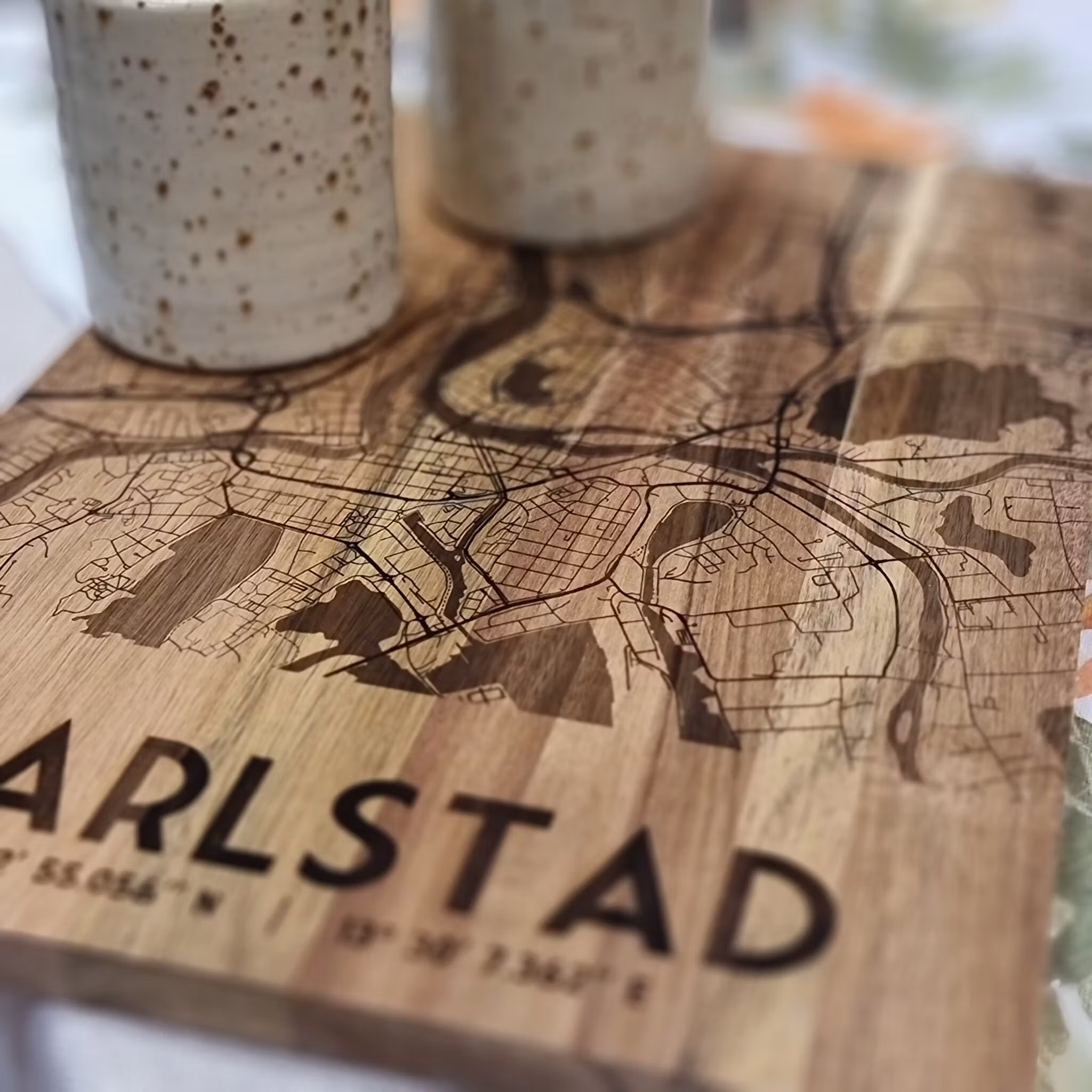 En stilren skärbräda i trä med ingraverad karta över Karlstad – både praktisk och dekorativ. Perfekt som gåva till hemvändaren, Karlstadbon i förskingringen eller bara den som bär staden i hjärtat. Passar lika bra som skärbräda, serveringsbricka eller köksdekoration. PS. om du skär på baksidan förstörs inte den fina ytan.