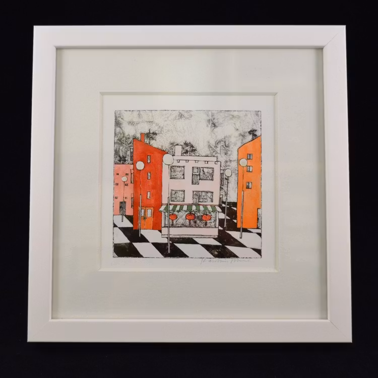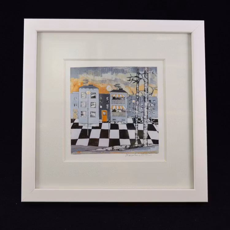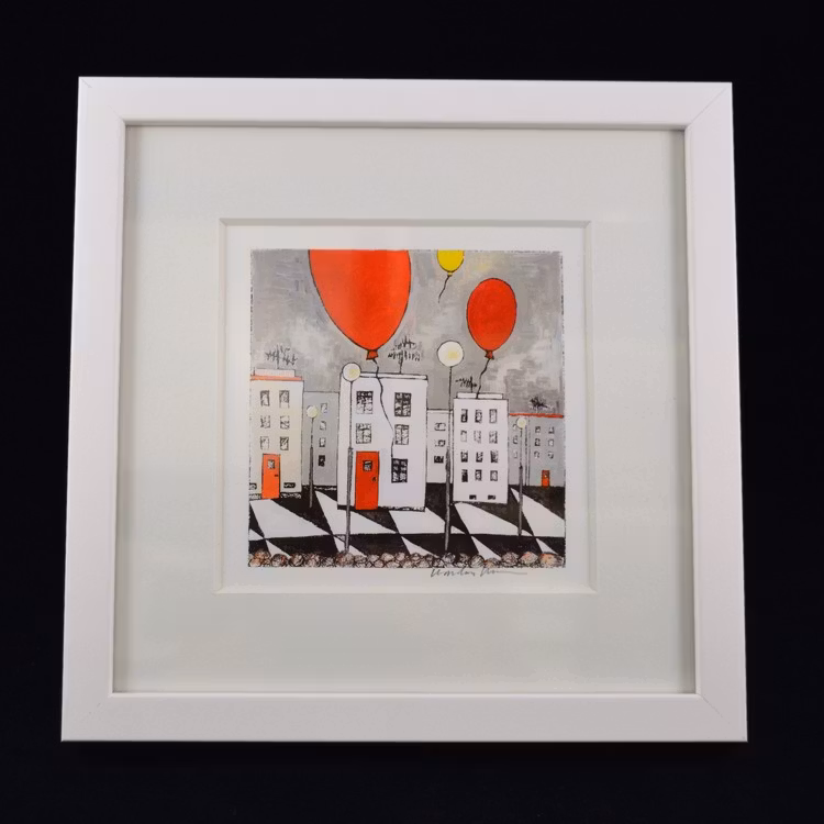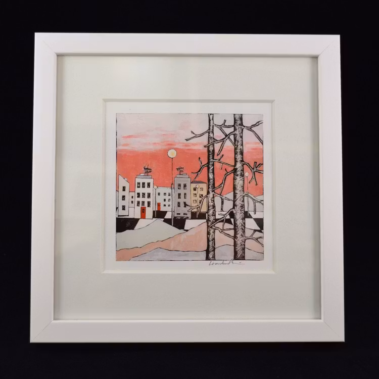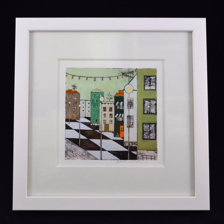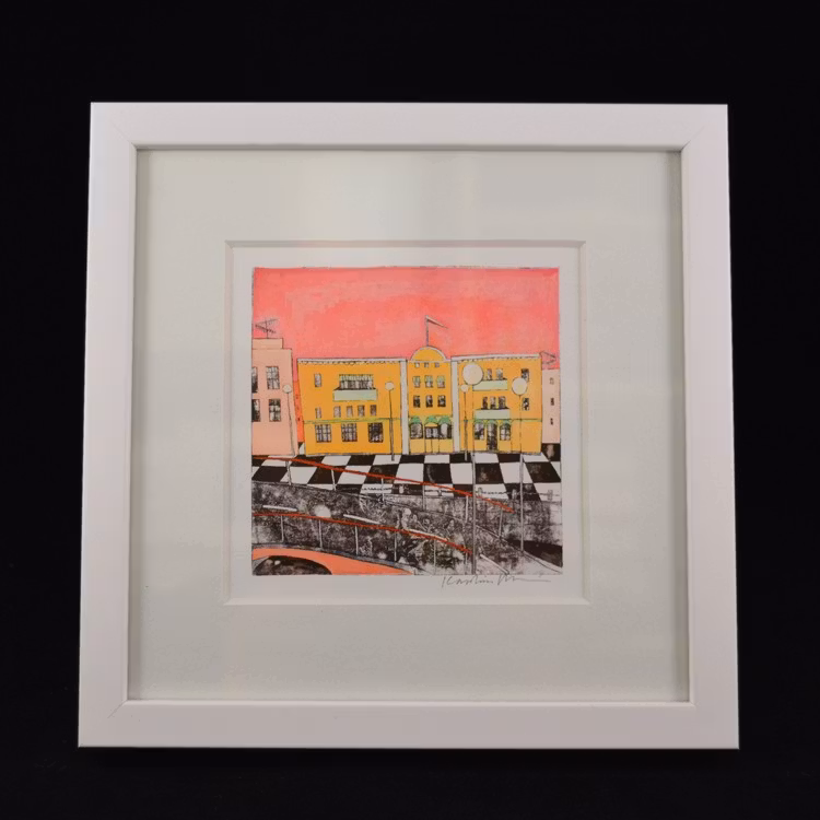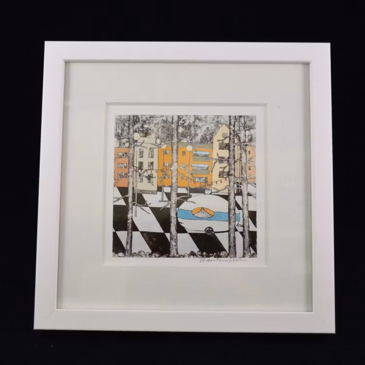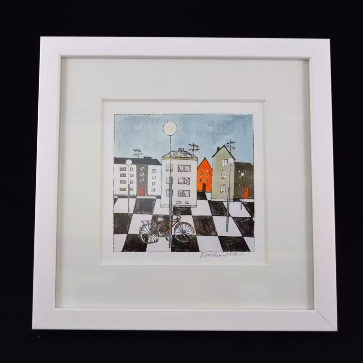Ett färgstarkt och naivistiskt konsttryck signerat av Karolina Nolin, en etablerad bildkonstnär från Karlstad som hämtar sin inspiration från stadens puls och arkitektur. Levereras i en svensktillverkad vitlackad träram – en stilren inramning till hennes lekfulla och uttrycksfulla motiv.