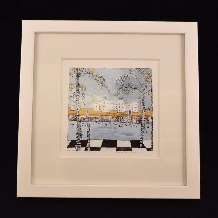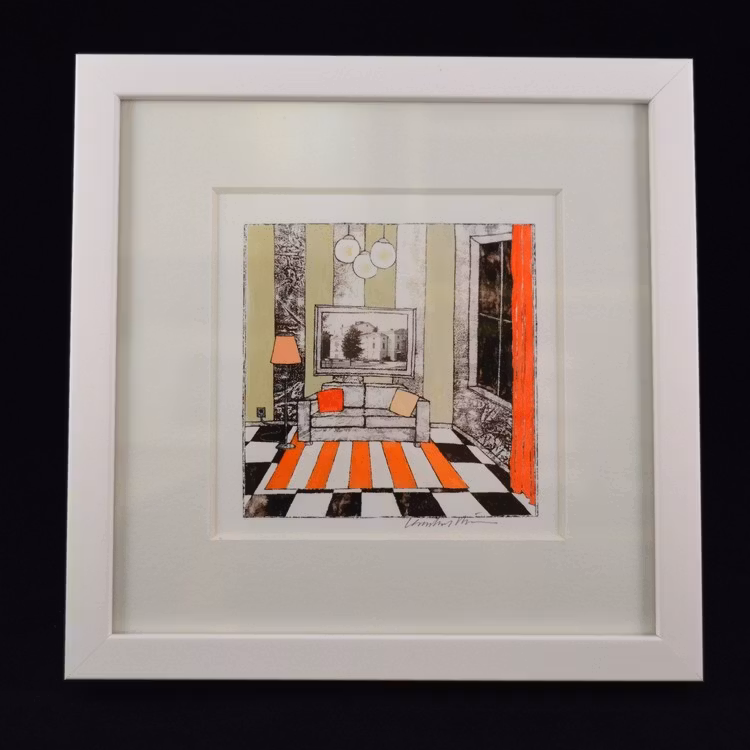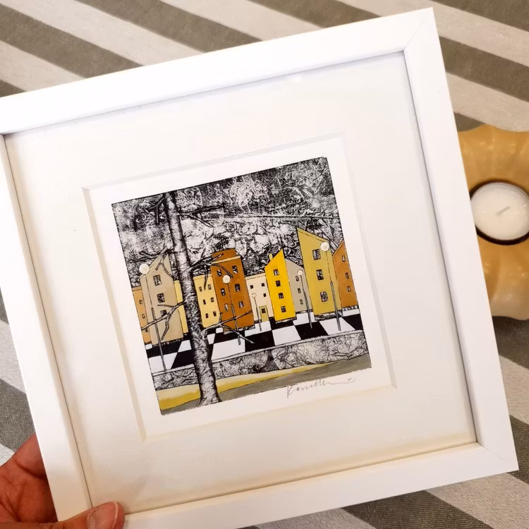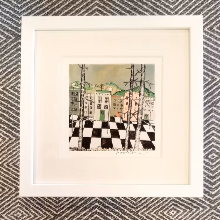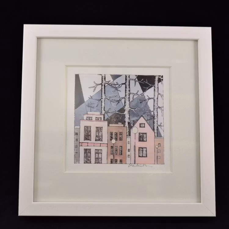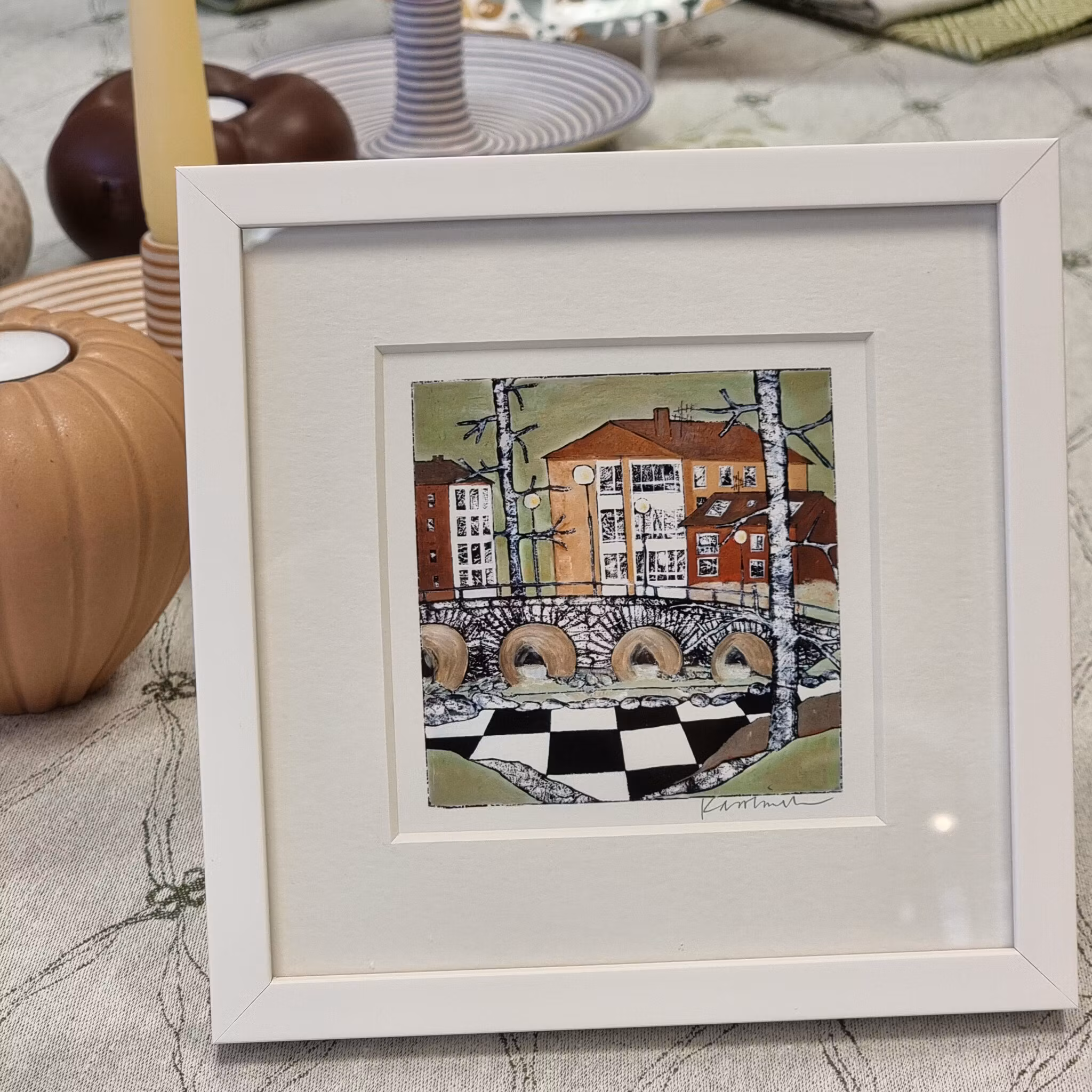 Ett färgstarkt och naivistiskt konsttryck signerat av Karolina Nolin, en etablerad bildkonstnär från Karlstad som hämtar sin inspiration från stadens puls och arkitektur. Levereras i en svensktillverkad vitlackad träram – en stilren inramning till hennes lekfulla och uttrycksfulla motiv.