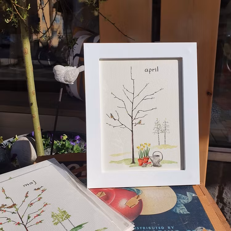 En vacker månadstavla av Tina Järdhult med 12 motiv i samma ram, där varje bild skildrar årstidens skiftningar månad för månad. Ett och samma träd följer årets cykel och fångar naturens förändring i en stilren och stämningsfull komposition – en dekorativ detalj för hemmet som låter årstiderna leva vidare på väggen. Mått 19 x 24 cm.