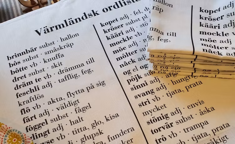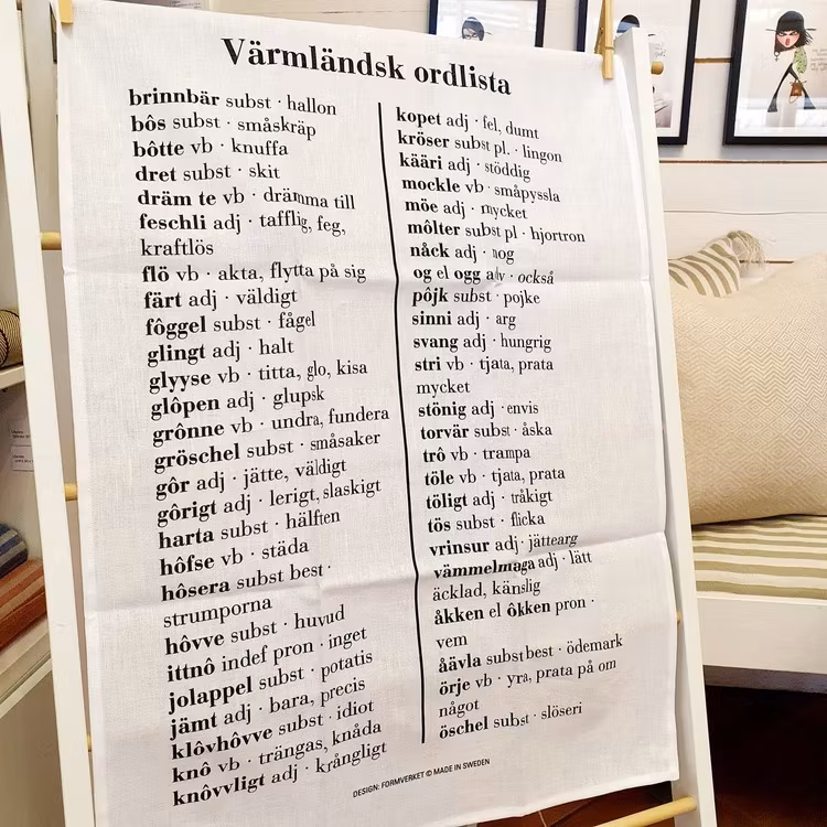 En handduk för den språkälskande värmlänningen! Här hittar du en samling av typiska värmländska ord som klövhövve, jämt och gör, perfekt för den som vill hålla dialekten levande – både i köket och på väggen eftersom den funkar att rama in. En lokal språkklenod med både charm och humor! 50% bomull, 50% lin. Mått 50 x 70 cm.